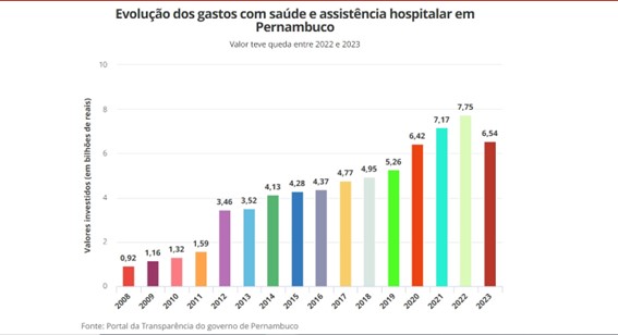 17 de maio de 2024Em um ano, o governo de Pernambuco reduziu em pouco mais de R$ 1,2 bilhão o volume de gastos com investimentos em assistência hospitalar e ambulatorial. Um levantamento da TV Globo com base em dados do Portal da Transparência mostra que, em 2023, o estado investiu R$ 6,54 bilhões na área. Em 2022, o total investido foi de R$ 7,75 bilhões. Uma redução de 15% (veja vídeo acima).